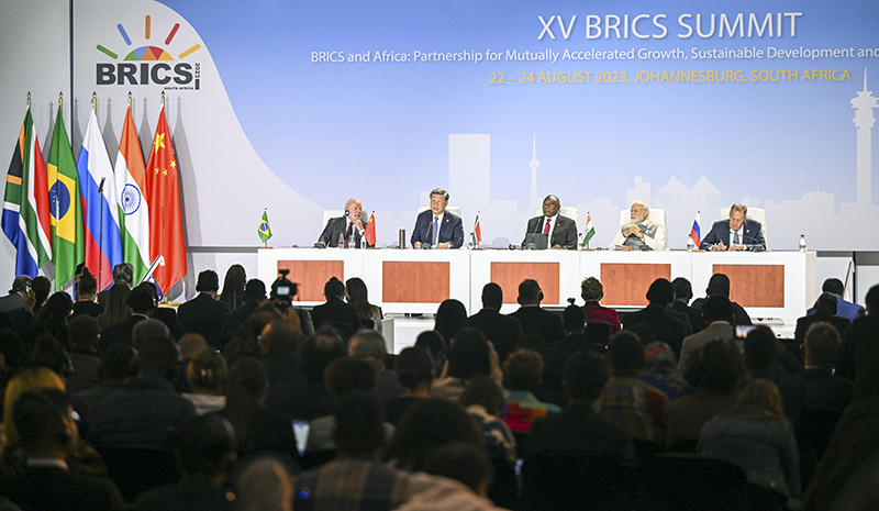 当地时间8月24日上午,国家主席习近平在约翰内斯堡出席金砖国家领导人第十五次会晤特别记者会。会议宣布,邀请沙特、埃及、阿联酋、阿根廷、伊朗、埃塞俄比亚正式成为金砖大家庭成员。这是习近平发表重要讲话。新华社记者 谢环驰 摄 习近平强调,这次扩员是历史性的,体现了金砖国家同发展中国家团结合作的决心,符合国际社会期待,符合新兴市场国家和发展中国家共同利益。这次扩员也是金砖合作的新起点,将给金砖合作机制注入新活力,进一步壮大世界和平和发展的力量。我相信,只要我们齐心协力,金砖合作大有可为,金砖国家未来可期。让我们共同努力,谱写新兴市场国家和发展中国家团结合作谋发展的新篇章! 南非总统拉马福萨主持,巴西总统卢拉、印度总理莫迪和俄罗斯总统普京(线上)出席。 会议通过并发表《金砖国家领导人第十五次会晤约翰内斯堡宣言》。 蔡奇、王毅等参加会议。